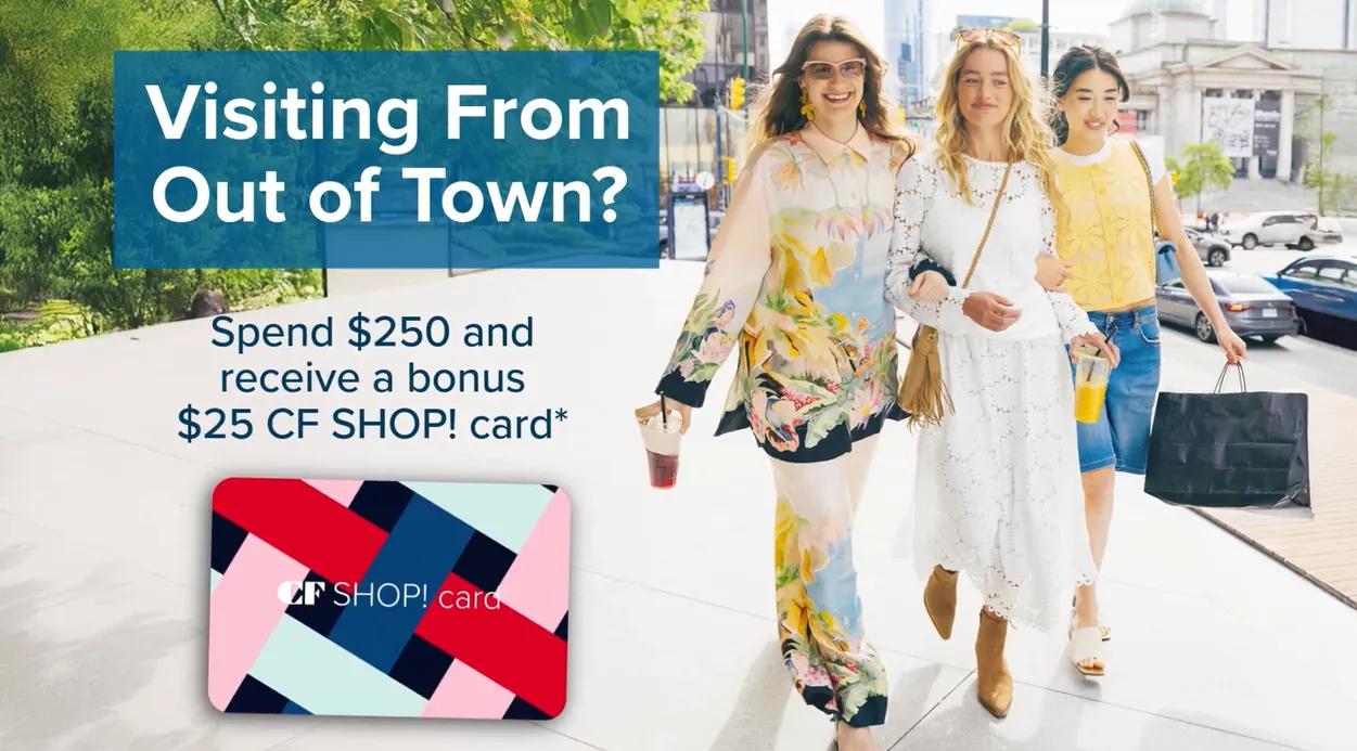 *Spend $250 And Receive A Bonus $25 Vancouver Promotional CF SHOP! card® Show Guest Services, at CF Pacific Centre, retailer receipts that total to $250 before taxes. Have a valid government issued photo ID. Must be from outside the lower mainland. Tourists who spend $250 (before tax) at CF Pacific Centre Retailers and show the Destination Perk Pass offer on their mobile device receive a bonus $25 Vancouver promotional CF SHOP! Card. Offer valid June 15 - October 15, 2025 or while supplies last. Maximum offer $25.00 promotional CF SHOP! card bonus card per customer. CF Pacific Centre Retailer receipts must total $250.00 before tax and spend in one day. Customers must show the Destination Perk Pass offer on their mobile device. Offer available at Guest Services at CF Pacific Centre only and must be physically present to claim the offer. Customers must show valid government issued photo ID) to show they live outside the Lower Mainland. (No health cards or student ID). Customers must be the age of majority in the province of British Columbia or 19 years of age or older at time of claim. Cadillac Fairview Corporation Limited reserves the right to terminate the promotion or change the terms of the promotion at any time. The offer cannot be transferred to, shared with or sold to any other person. Violations of these terms will result in the forfeit of the offer Decisions of The Cadillac Fairview Corporation are final. The Vancouver Promotional CF SHOP! card is issued by Peoples Trust Company. Funds are not insured by the Canada Deposit Insurance Corporation (CDIC). -Funds expire 30 days after activation, no extensions. Not reloadable. Not redeemable for cash. Can be used only once ® a registered trademark of The Cadillac Fairview Corporation Limited.